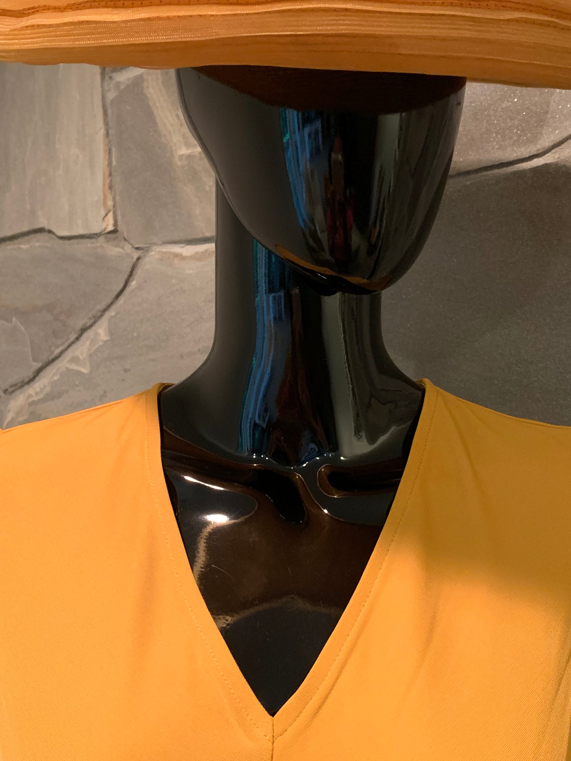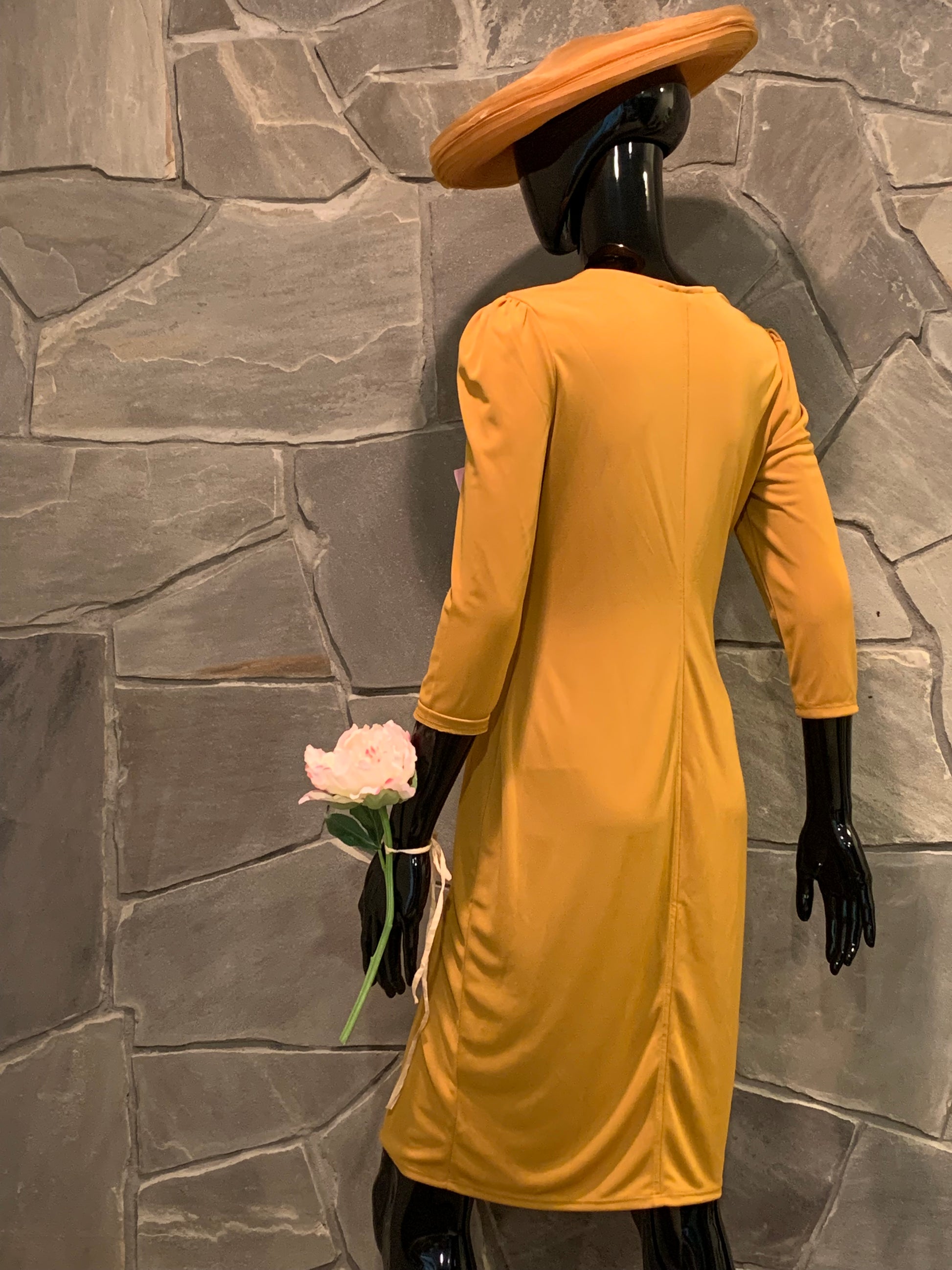 Our Lark & Ro mustard twist front knee length dress is figure flattering. It has a V-neck, three quarter sleeves and hits right above the knee. This dress is stunning and may be worn for a dressy or casual event depending on your accessories. You'll look like a million bucks even though you spent a lot less!