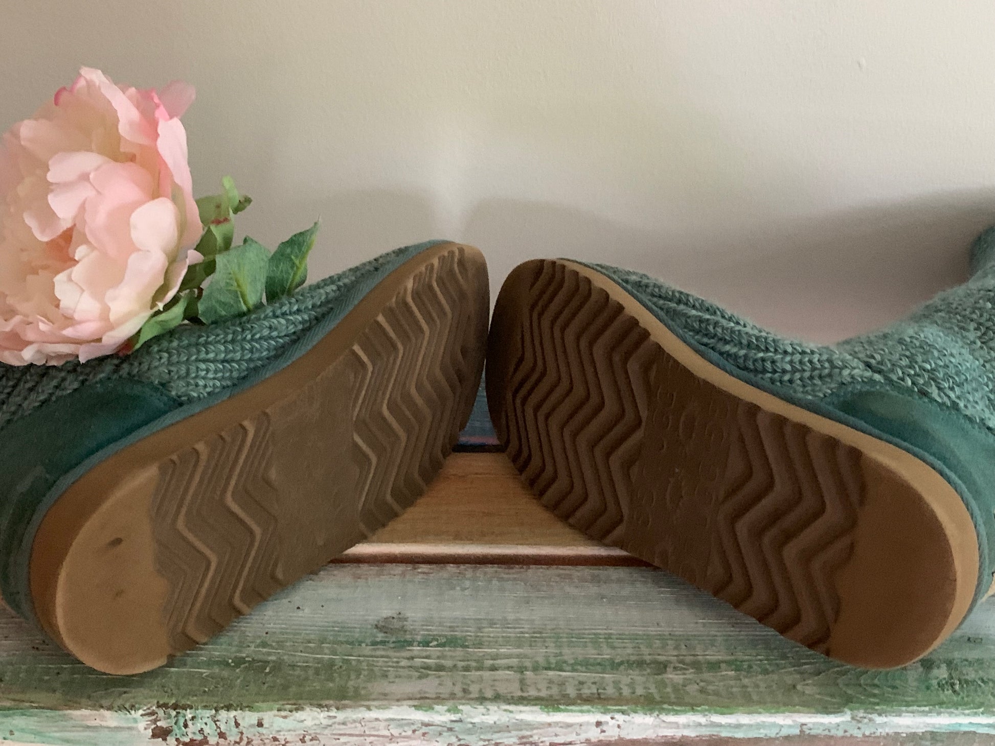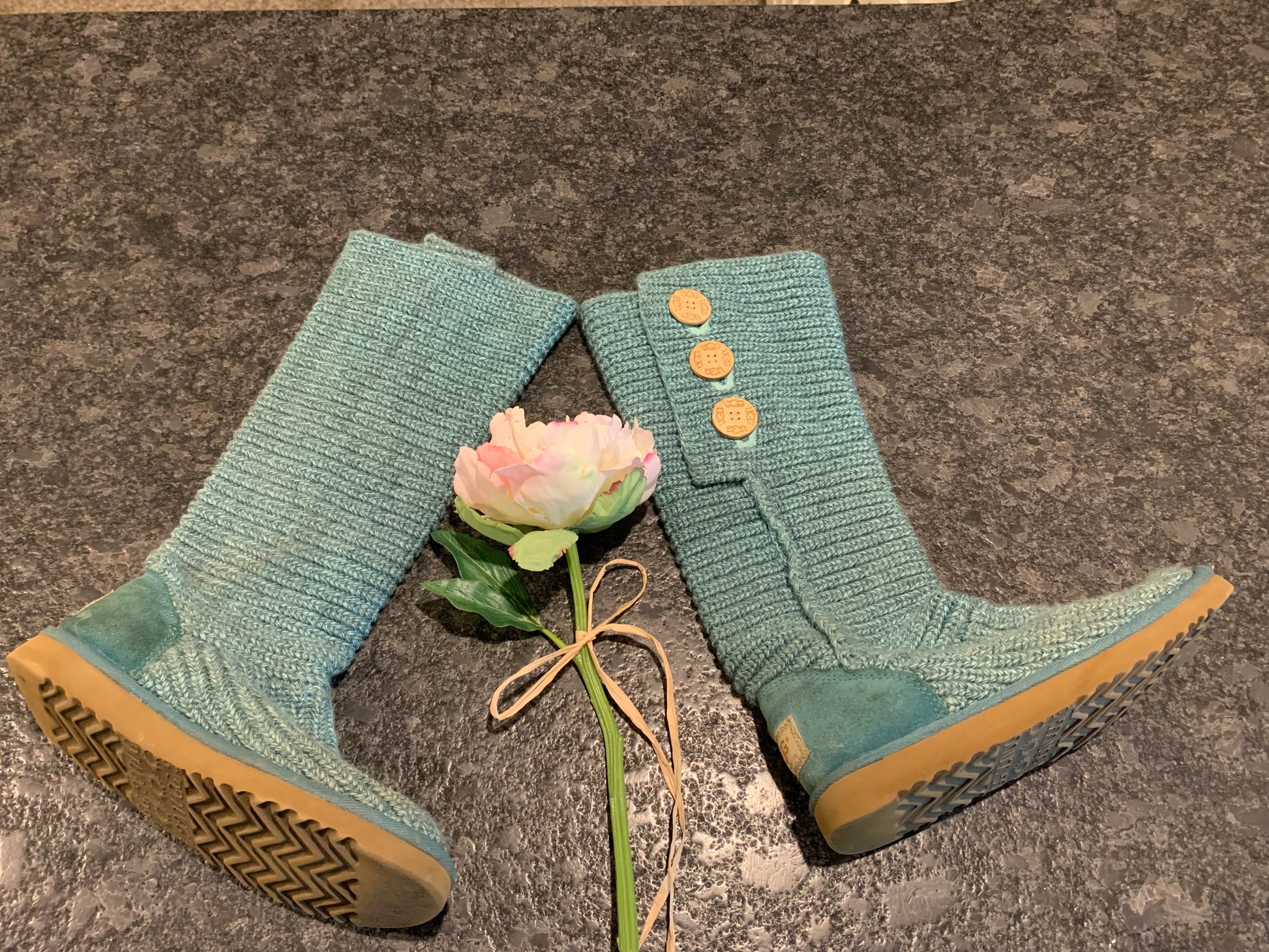 Our Ugg classic cardy blue green boots are on trend and broken in for your comfort. The classic silhouette is recast in a warm, chunky sweater soft knit that's convertible based on how you feel-pull all the way up the calf to display the three large functional wood buttons, slouch it down a bit, or fold the top of the boot over for a shorter style that displays three smaller buttons. Style these fabulous boots with slim pants and a leather bomber for your weekend events.